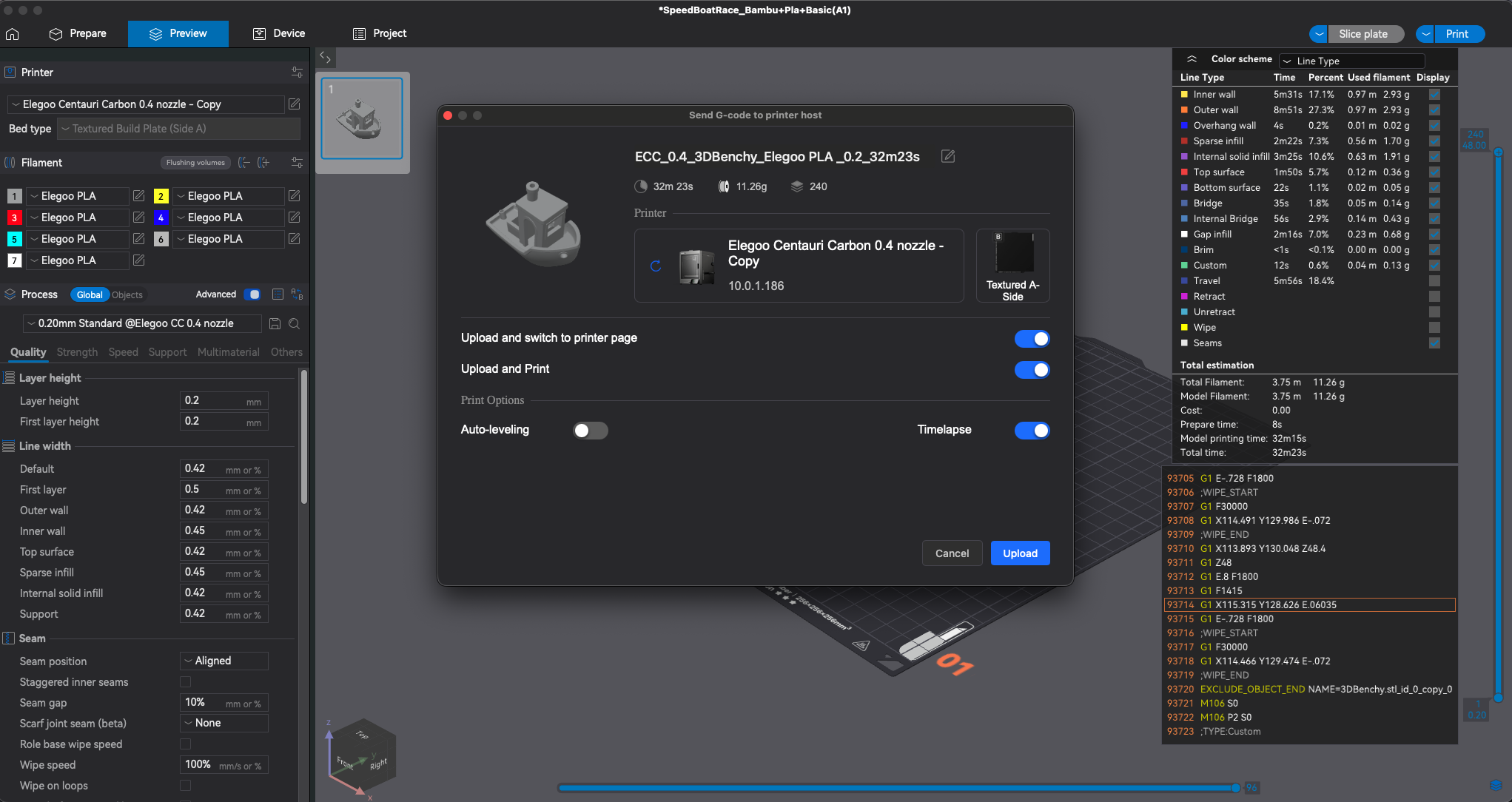 You should turn on the options for "Upload and Print" and "Upload and switch to printer page" and click the Upload button. After a few seconds it should switch to another screen. This screen shows you the progress of the print and a live video from inside the printer (if your printer has a built-in camera). And the printer should start printing. You will see updates in the slicer software as well as on the screen attached to the printer.