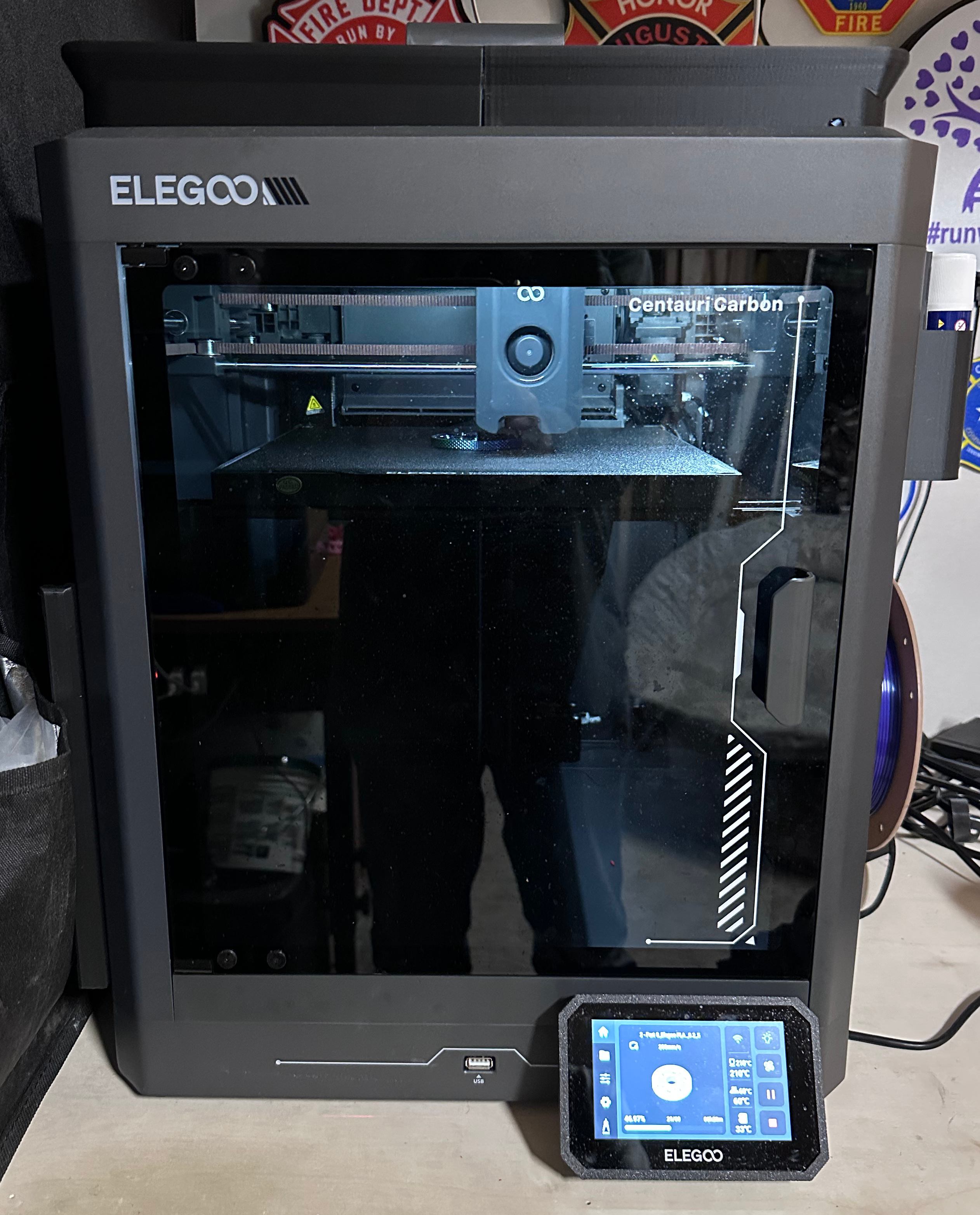 We made an addition to our little 3D print farm - the Elegoo Centauri Carbon. The printer is similar to our Bambu Lab printers, but it only prints in a single color. The printer is fast and the prints turn out great. Was a great investment at only $300. Would be a great printer for anybody looking to start 3D printing. The printer is enclosed with a glass top and front door. The spool is mounted on the side, so it doesn't need a lot of space. Unboxing and setup was very easy. Once you removed the transport screws from the inside of the printer and plugged it in you are ready to print. Setup takes a few minutes while it calibrates everything. The touchscreen display is great and allows you to control most every aspect of the printer. The Elegoo slicer software is easy to use and makes it easy to print. I wish there was an iPhone app like Bambu has, but otherswise it is a great printer. If you are looking to get into 3D printing, $300 will get you a very capable and easy to use printer. Liam has been able to figure out how to work the slicer and the touchscreen, so he is making his own prints. He downloads thing to print by himself and imports them in to the slicer. He does it all except designing his own prints. But I'm sure he will be doing that soon enough! Liam gives the Elegoo Centauri Carbon 5/5 stars!